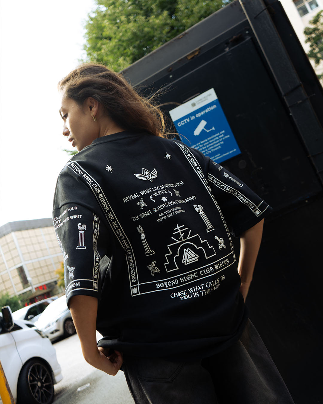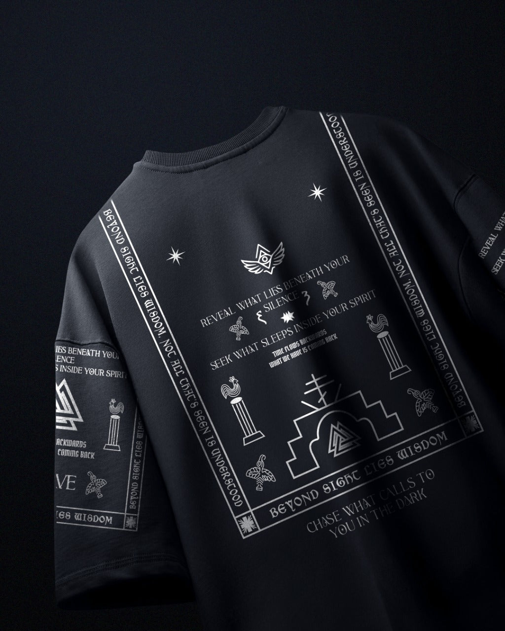 This is not your average black graphic tee. It’s a coded manifesto for those tuned into the underground frequency. Loaded with esoteric symbolism, directional glyphs, and spiritual iconography — puff printed across the chest, back, and sleeves — this shirt becomes your statement. Your armor. Your language.
