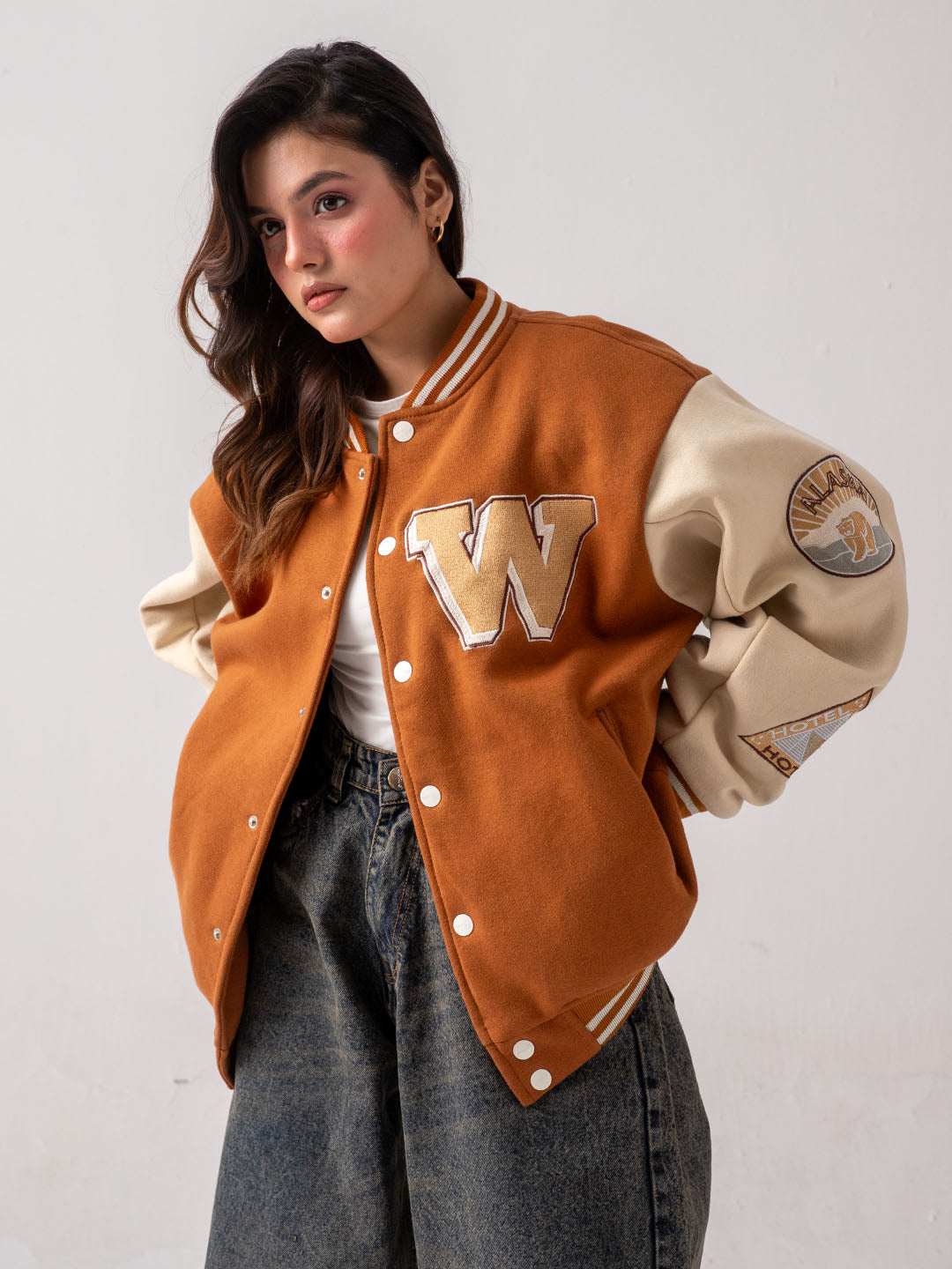 • Oversized W varsity chenille patch on chest