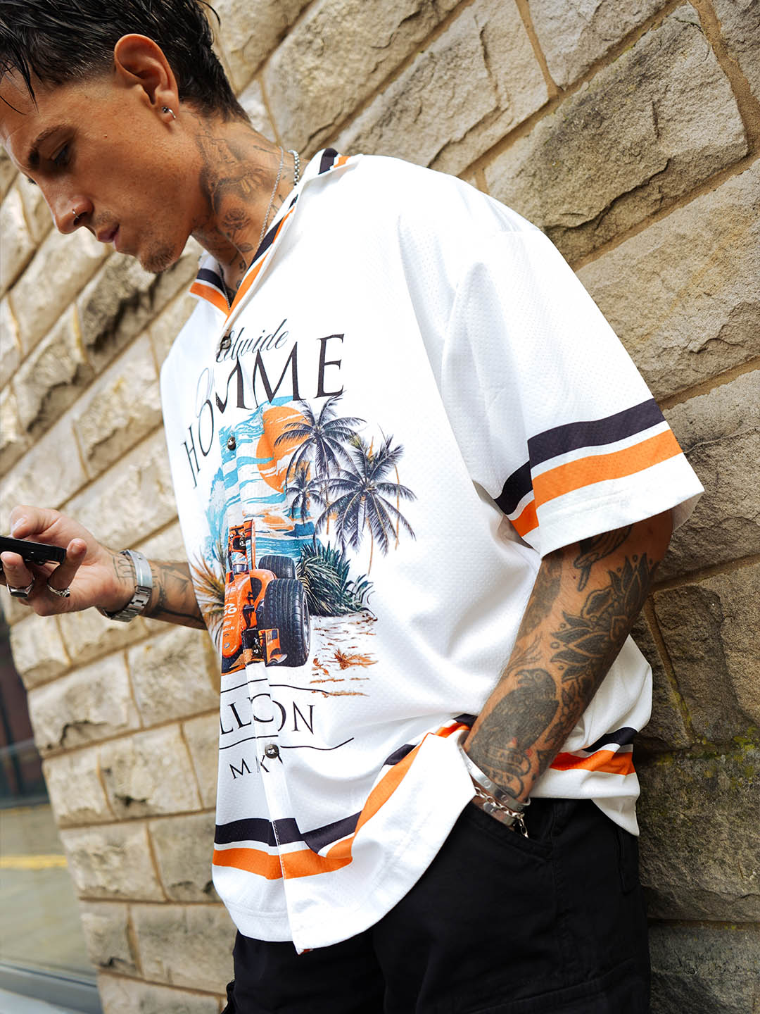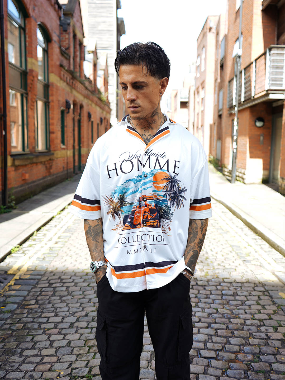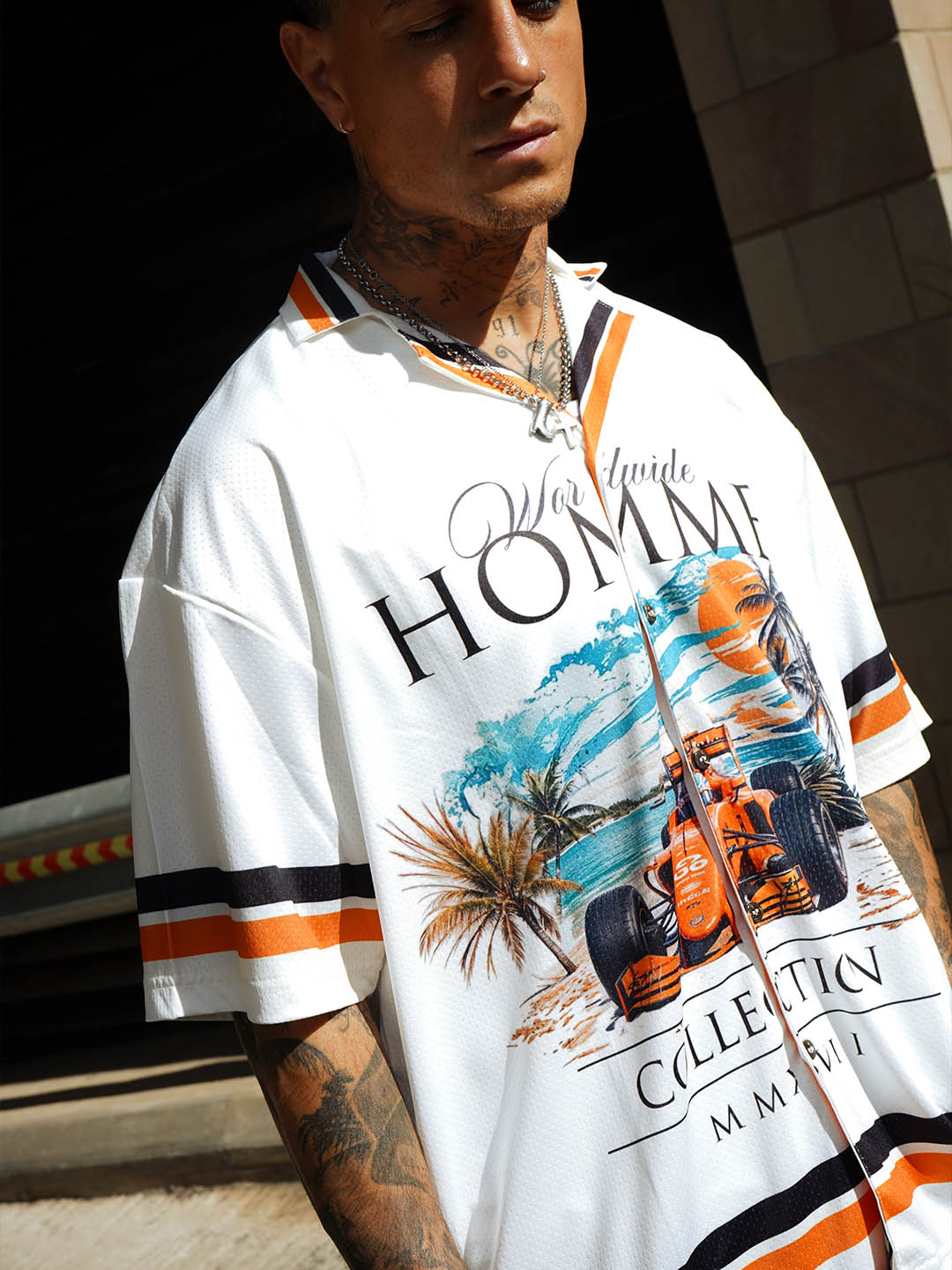 A new classic for the culture. The HOMME Coastline Jersey blends laid-back island aesthetics with the bold expression of streetwear. Featuring a vibrant coastal scene and vintage-style typography, this piece is built for the heat — on the street or by the shore.